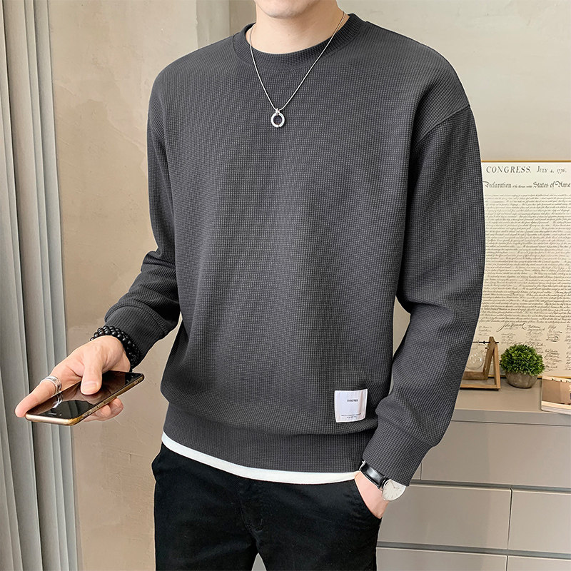 华夫格卫衣男春秋款纯色2022春季潮流宽松圆领长袖休闲男士假两件热门设计联盟服务商